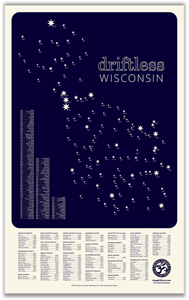 Wonder your mind and challenge your knowledge of driftless Wisconsin geography with this beautiful new map of the region. Seven-pointed stars sized according to population denote cities, towns, and villages throughout driftless Wisconsin, each one annotated with a code. Use the legend on the bottom to find the code for each municipality, or the legend within the map to identify municipalities by code. Fun for the whole family or just you by yourself when you're so bored you're looking at flat 2-dimensional objects—best case scenario, it's framed neatly and hanging on your wall at eye level.